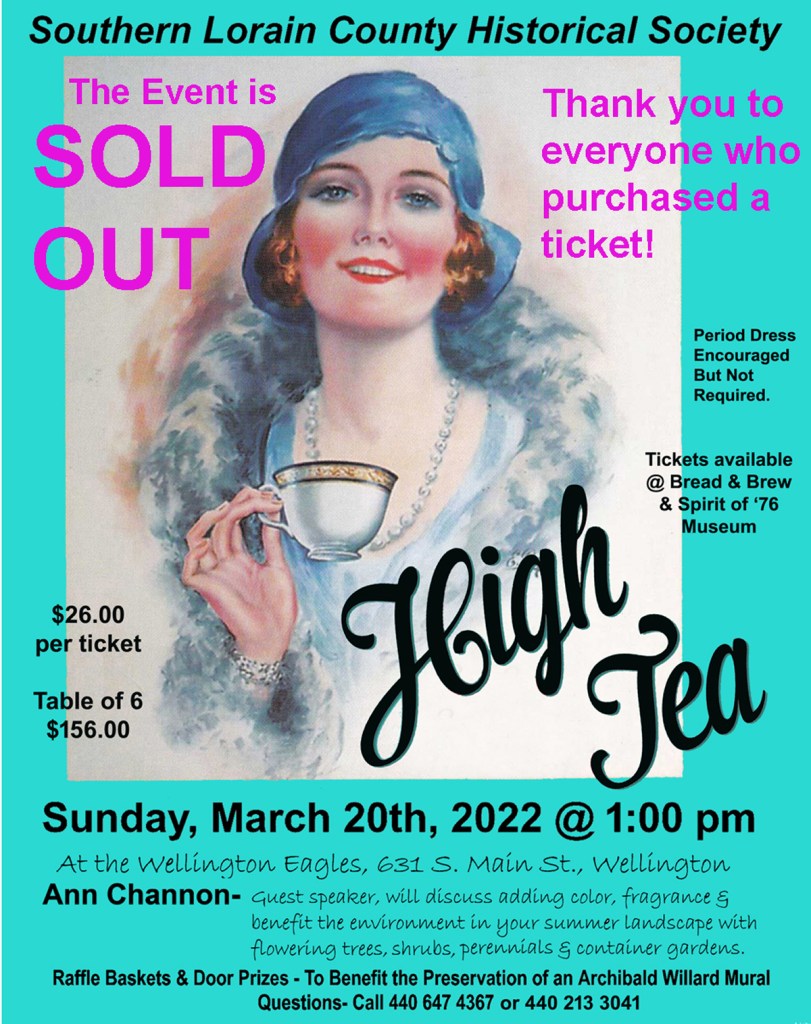 The Southern Lorain County Historical Society will be hosting a High Tea on Sunday, March 20 to raise funds towards the preservation of the second Archibald Willard mural. The event will also feature raffles, door prizes, and guest speaker Ann Channon.