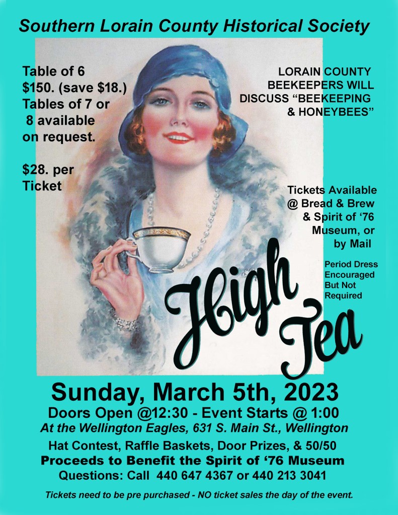 The Southern Lorain County Historical Society will be hosting a High Tea on Sunday, March 5 to benefit The Spirit of ’76 Museum. The event will also feature raffles, door prizes, and a presentation by the Lorain County Beekeepers Association.